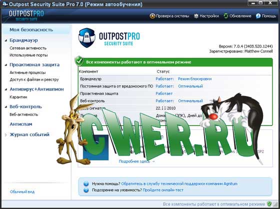 Outpost Security Suite Pro - это интегрированный продукт, который обеспечивает всестороннюю многоуровневую защиту ПК от всевозможных интернет-угроз. Содержит все разработки Agnitum — антивирус, атишпион, брандмауэр, антиспам, веб-контроль и проактивную защиту.