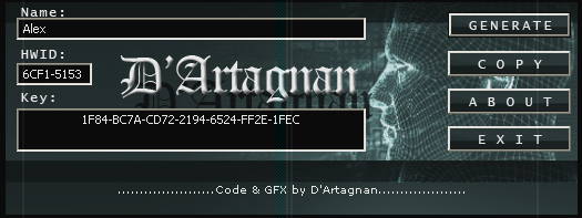 2. Запустите кейген (файл MCF_13th_Skull_Keymaker.exe) и вставьте скопированный код в строку HWID. В строку Name введите латиницей любое имя и нажмите кнопку GENERATE.: