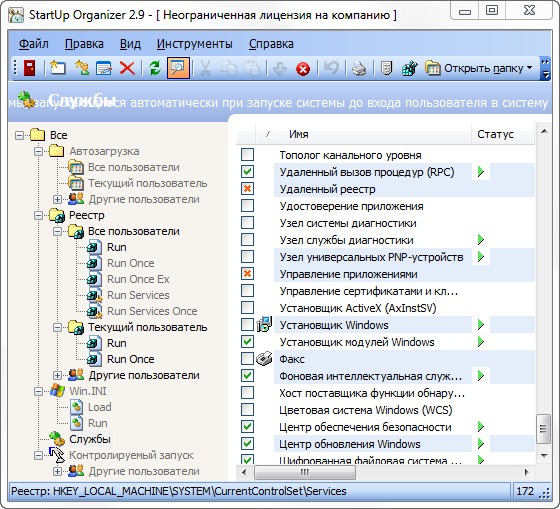 Программа Startup Organizer выводит полный список приложений, запускающихся с помощью стандартных средств автозагрузки Windows, реестра, в качестве служб. С помощью данной программы возможны изменения списков автозагрузки всех пользователей, чьи учётные записи присутствуют в системе (естественно, при условии активной учётной записи администратора).