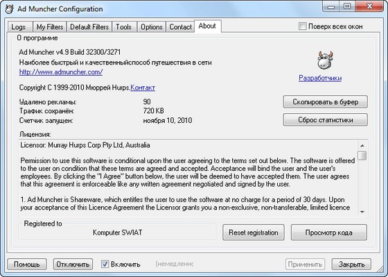 Ad Muncher - утилита для удаления всплывающих окон и баннерной рекламы. Главная особенность - небольшой размер. Работает из системной панели, интегрируется практически со всеми браузерами, а также удаляет рекламу из ICQ, Morpheus, Kazaa, iMesh и некоторых других программ. Несмотря на скромный размер, программа великолепно удаляет рекламу с посещаемых страниц, определяя их по: адресу, размеру, подписи (тэг alt). Стоит ее установить и можно вздохуть свободно, корова "схавает" всю рекламу, и вы лишитесь баннеров, счетчиков, поп-апов и прочего мусора на страницах сайтов и удивитесь, как это вы жили до этого!
