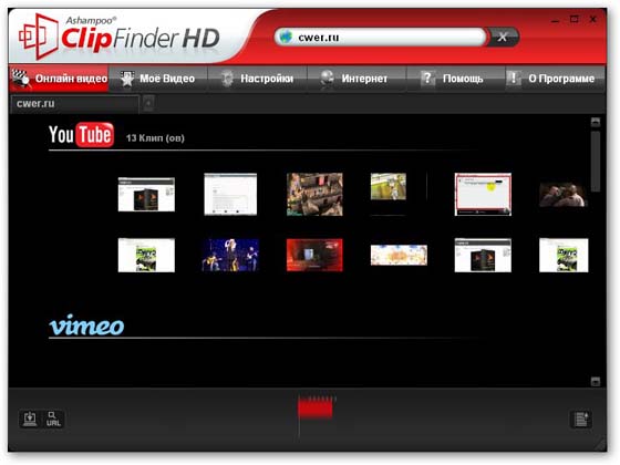 Ashampoo ClipFinder HD - программа для поиска и загрузки видео файлов, расположенных на разных видео-хостингах. Обладает красивым и удобным интерфейсом, благодаря чему работа с программой оставляет только положительные впечатления. Программа способна проводить одновременный поиск видеоклипов по многим сайтам, включая YouTube и MySpace, показывая подробные сведения о каждом найденном видео файле (название, продолжительность, скриншот и др.). Перед загрузкой любого интересующего видео пользователь может просмотреть его в окне предпросмотра. Кроме того, тут присутствует функция загрузки файлов по пользовательским ссылкам. В программе имеется специальный раздел для сбора и просмотра лучших видеоклипов, в который можно добавлять любые файлы в формате FLV. Поддерживаются сменные визуальные темы и имеется мультиязычная поддержка, включая поддержку русского языка.