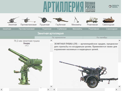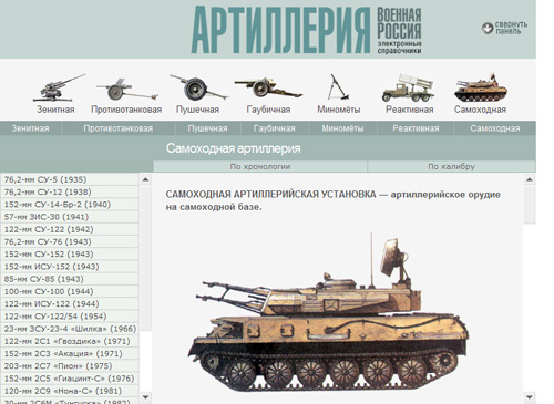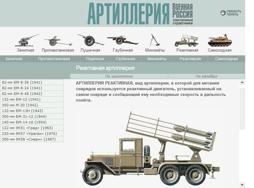 В этой электронной энциклопедии вы найдете данные по зенитной, противотанковой, пушечной (полевые, осадные, горные, крепостные орудия, пушки-гаубицы), гаубичной артиллерии (в том числе единороги и мортиры), миномётам, реактивным установкам, системам залпового огня, самоходным артустановкам.