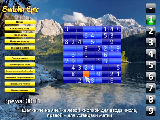 В игре Sudoku Epic несколько режимов сложности, 5 размеров полей, возможность сохранения и дружелюбный интерфейс. Игровой процесс сопровождают великолепные природные фоны и расслабляющая музыка.