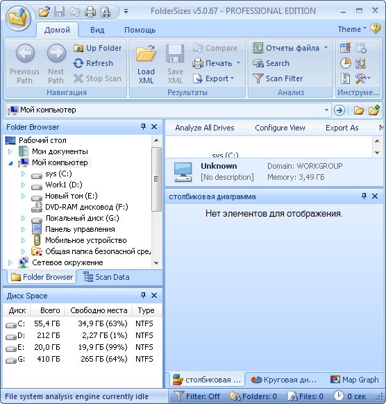 Эта программа позволит вам провести проверку жестких дисков на наличие на них свободного места. Если вы никак не можете понять, почему места осталось так мало, запустите FolderSizes Pro, и программа создаст для вас полный отчет. Программа сгенерирует диаграммы, которые наглядно покажет, какие папки занимают больше всего места. Среди возможностей программы: Распечатка отчетов, экспорт их в HTML; Экспорт диаграмм в файлы JPEG, PNG, BMP или TIFF; Система создания отчетов по типам файлов, которые занимают больше всего места.