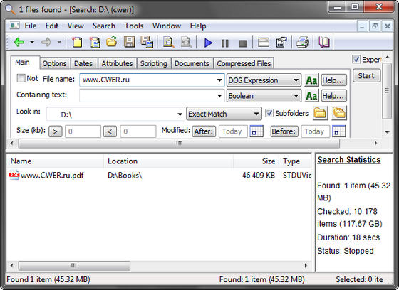FileLocator Pro - очень мощное программное решение для поиска файлов на ПК. Возможность поиска файлов в ZIP, CAB, PDF, Word файлах, поиск строкового содержания в файлах, поддержка Active Scripting для написания собственных скриптов для поиска, экспорт результатов поиска в Text, CSV, HTML, XML форматы, встроенный просмотрщик файлов, поддержка плагинов, масса опций и расширений для поиска.