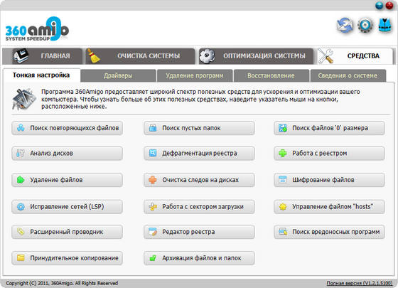 360Amigo System Speedup - инструмент, который поможет вам оптимизировать работу компьютера и исправить ошибки в его работе. В программу 360Amigo System Speedup входят инструменты для очистки системы, оптимизации системы и целый набор инструментов, созданных специально для улучшения работы компьютера.