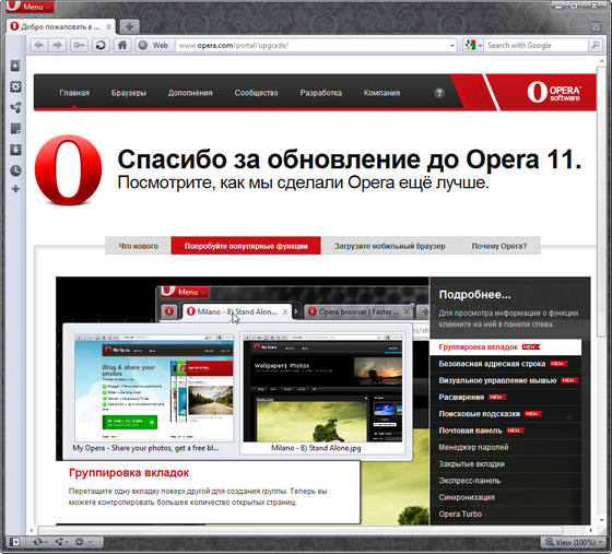 Opera — один из самых быстрых и гибких в настройке браузеров. Используя скины, пользовательские панели и другие средства настройки интерфейса, его внешний вид можно изменять до неузнаваемости. Программа позволяет «на лету» отключать и включать графику, а также может похвастаться фирменной технологией масштабирования веб-страниц, благодаря которой пользователи браузера практически никогда не видят горизонтальной прокрутки.