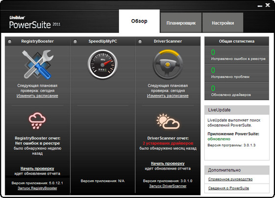 Uniblue PowerSuite - комплект программ для ускорения работы системы, очистки и оптимизации реестра, моментального обновления драйверов, для более эффективной работы вашего компьютера. Каждая из них программ приспособлена для оптимизации определенного участка операционной системы, а вместе они составляют полный комплекс инструментов от всех системных проблем вашего компьютера.
