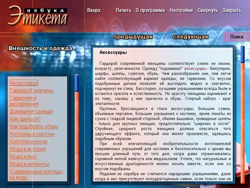 На диске рассказывается о различных сторонах сложной области, именуемой этикетом и правилами отношений: разделы, посвященные правилам поведения в гостях, за столом, при официальных приемах и т.д.