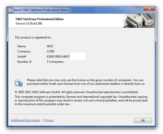 Скачать программу O&O SafeErase 5 Professional Edition 5.0.366 х86 (35 МБ):