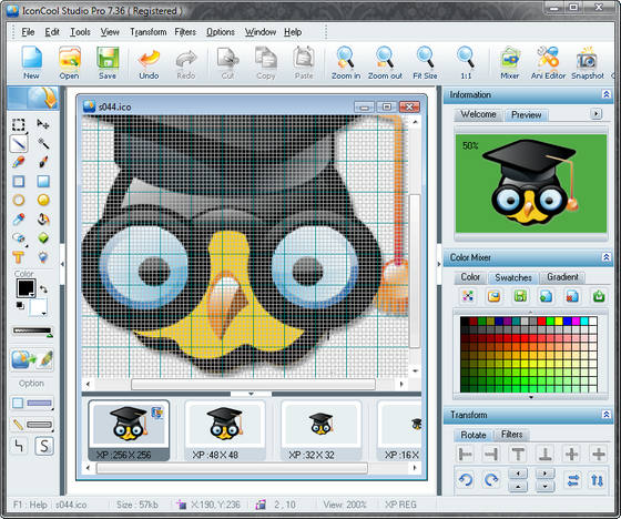 IconCool Studio - программа для создания и редактирования иконок. Утилита позволяет также импортировать и экспортировать иконки, содержит значительное число художественных инструментов для создания и редактирования иконок стандартных и специальных размеров. С помощью IconCool Studio можно создавать значки любых размеров, с глубиной цвета вплоть до 32bit True Color, создавать полупрозрачные иконки, экспортировать иконочные картинки в Photoshop, редактировать анимационные GIF файлы.
