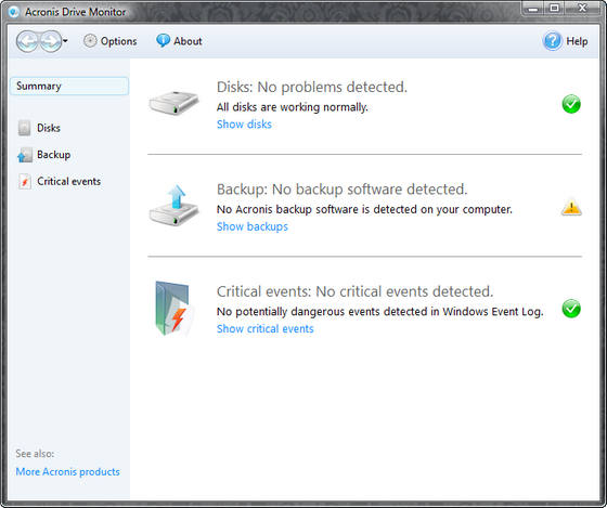 Acronis Drive Monitor - это программа, которая, используя данные S.M.A.R.T., производит контроль за состоянием жестких дисков, и в случае изменения их параметров выдает предупреждение. При наличие на ПК таких продуктов резервного копирования компании Acronis, как Acronis True Image Home 2010, Acronis Backup and Security 2010 и Acronis Backup & Recovery 10, позволяет в критических случаях, т.е. тогда, когда анализируемые параметры физического жесткого диска указывают на его близкую кончину, выполнить автоматическое резервное копирование данных.