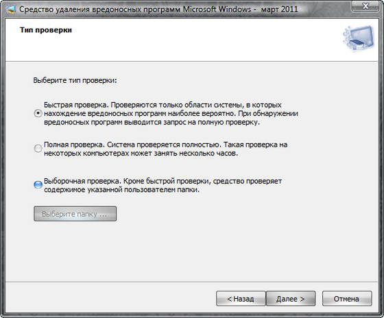 Microsoft Malicious Software Removal Tool - утилита для обнаружения и удаления наиболее распространённых вирусов. Microsoft Malicious Software Removal Tool выполняет проверку компьютера на наличие наиболее распространенных вредоносных программ (включая Blaster, Sasser и Mydoom) и удаляет их в случае обнаружения. Поскольку компьютеры, будучи зараженными, на первый взгляд могут работать нормально, специалисты из Microsoft рекомендуют запустить данное средство даже, если вам кажется, что с компьютером все в порядке. Утилита не требует инсталляции. С её помощью сканирование системы на наличие вирусов занимает всего несколько секунд. Из дополнительных опций можно отметить предоставление детальной информации о том или ином вирусе, распознаваемом утилитой (для этого нужно кликнуть мышкой на название вируса и перейти на сайт Microsoft с информацией о нём).