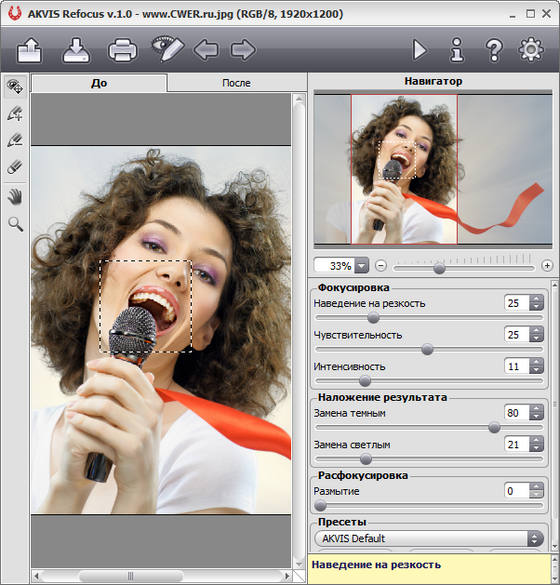AKVIS Refocus помогает повысить резкость нечетких, размытых, расфокусированных снимков. С помощью программы можно исправить изображение целиком или "привести в фокус" только определенный объект, выделив его на фоне элементов второго плана.