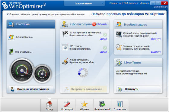 Ashampoo WinOptimizer - новая 8ая линейка пакета программ, позволяющего оптимизировать операционную систему за счет ее настройки и очистки. Включает в себя утилиты для очистки жесткого диска и системного реестра, модуль для обеспечения защиты личной информации путем поиска и удаления файлов и данных, оставшихся после интернет-cepфингa, утилиту для оптимизации интернет-соединения, модуль для настройки программ, автозагружаемых одновременно с запуском системы, а также модули для поиска и удаления ненужных файлов DLL, для безвозвратного удаления данных и для шифрования файлов. Кроме этого, программа позволяет переназначать ассоциации файлов, шифровать и расшифровывать файлы, а также безвозвратно их удалять. Наконец, возможна настройка параметров системы и ее оптимизация за один клик. В шестой версии программы появилось немало новых возможностей, новые модули, включая новый антишпионский модуль и менеджер контекстного меню Windows, а также множество улучшений и исправлений.