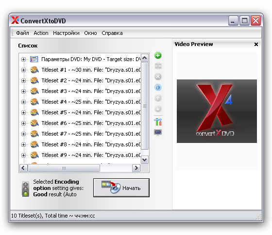 ConvertXtoDVD - программа, предназначенная для преобразования видео в формат, совместимый с DVD Video, и последующей записи содержимого на DVD. Программа поддерживает видео файлы AVI, Mpeg, Mpeg4, DivX, Xvid, MOV, WMV, WMV HD, DV, MKV, DVD, а также потоковое видео. Для работы программы не нужны внешние AVI-кодеки, поскольку она использует собственные. ConvertXtoDVD может автоматически создавать фрагменты (chapters), поддерживает наличие нескольких аудиодорожек, работает с субтитрами (.SRT .SUB/IDX .SSA). Также программа поддерживает создание несложного меню для DVD, в котором можно установить фон, выбрать цвет и другие параметры шрифта для надписей.