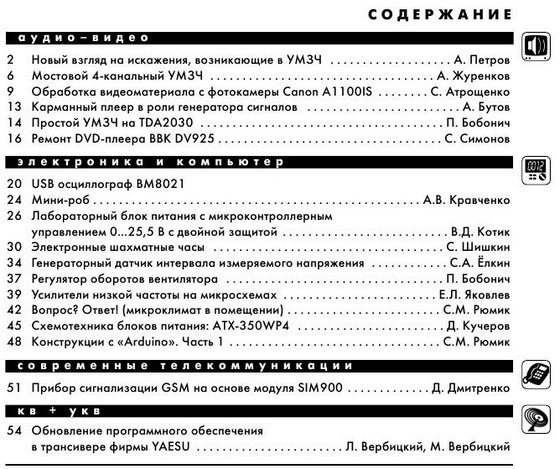 Основные разделы журнала: аудио, видео, электроника, компьютер, КВ и УКВ радиосвязь, современные телекоммуникации.