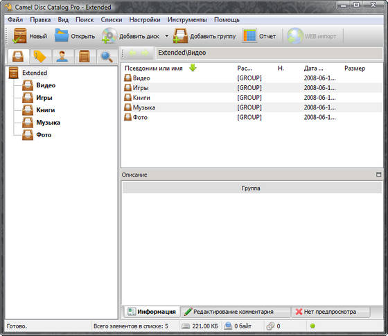 Camel Disc Catalog – универсальная программа для каталогизации CD\DVD дисков (или других сменных носителей, а также файлов на жестком диске). Для формирования домашней коллекции Вам нужно вставить диск в CD-ROM и запустить процесс сканирования. Программа сама сохранит список файлов и вспомогательную информацию о них (EXIF, IMDB данные, id3 теги и т.д.) в своей базе данных. Это позволит Вам в будущем найти нужный файл, не пересматривая кучу дисков вручную. После сканирования можно указать дополнительную информацию: комментарии, картинку, местоположение диска, назначить группу, категории, местоположение и т.д. Ваша коллекция может состоять из фильмов, музыки, фотографий или любых других файлов. Сами данные (будь то диск или другой носитель информации) могут находиться где угодно, в то время как информация о том, что хранится на каждом диске или в папке, будет всегда под рукой. Вы можете делиться своей медиа коллекцией со своими друзьями, передав им один единственный файл базы данных. Вы можете создавать отчеты о своих фильмах или музыке и выкладывать их в интернете.