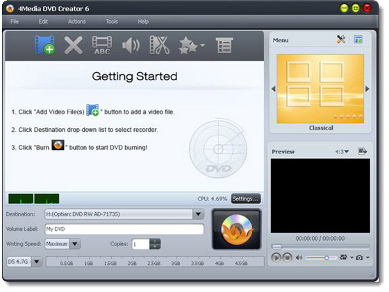 4Media DVD Creator - одна из лучших программ для создания DVD фильмов из разных видео файлов. Возможность просто записать на DVD MP4, MKV, AVI, MPEG, WMV, МТС, M2TS и так далее, сделать файл ISO образа. Это программное обеспечения позволяет записать DVD-диски с персональными меню и совместимо с большинством форматов дисков.