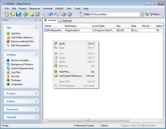 Setup Factory - быстрый и удобный в использовании инструмент для создания инсталляционных пакетов. В отличие от других подобных программ, он не требует долгого изучения. Программа создает компактный установочный файл, который запускается в любой версии Windows от 95 до Vista, и прекрасно подходит для распространения через сетевую закачку, CD-ROM, DVD-ROM и LAN. Функция Project Wizard поможет за несколько минут совершить все необходимые операции. Хотите ли вы создать ярлыки на рабочем столе и стартовом меню, или настроить деинсталлятор в панели управления - всего несколько нажатий клавиш, и результат налицо. То же относится к добавлению модулей периода работы третьей стороны, с поддержкой для Visual Basic, .NET и многого другого.