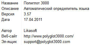 Полиглот 3000 (или сокращённо П3000) – это автоматический определитель языка, который предназначен для быстрого и корректного определения того на каком языке написан введённый Вами текст. Программа работает в операционных системах Windows 95/98/NT/ME/2000/XP/Vista/7.