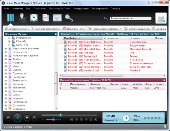 Helium Music Manager - многофункциональный музыкальный каталогизатор, дающий возможность систематизировать Вашу музыкальную коллекцию. Представляет из себя одновременно редактор тегов и имён файлов по тегам, музыкальную базу-каталог и создатель плейлистов по ней. Так же, есть возможность создания отчётов по коллекции и быстрый поиск по базе. Немаловажными плюсами является корректная работа со сменными носителями (CD/DVD) - файлы с них отображаются отдельно, поиск обложек/обзоров/названий треков по различным сервисам, запись CD/DVD, поддержка плагинов, есть даже плагин для Winamp и многое другое.