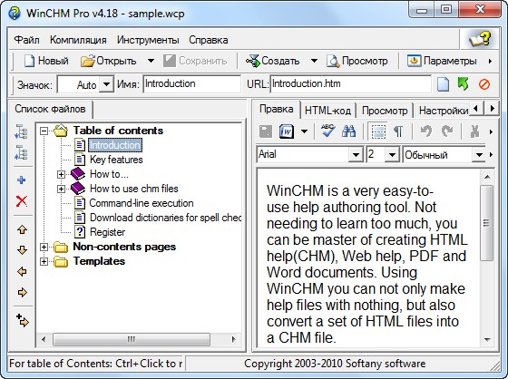 WinCHM - удобная программа для создания файлов справки, книг или журналов в форматах HTML-справка (CHM), веб-справки, PDF и документах Word. Страницы справок создаются в удобном редакторе, большим плюсом является то, что она не использует сторонних компиляторов, при этом имеет сравнительно небольшой размер. Особенности: встроенный визуальный HTML-редактор; автопоиск html-файлов и автосоздание оглавления; редактор оглавлений и значков; визуальный дизайнер CHM.