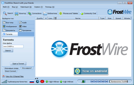 FrostWire - клиент пиринговых сетей, детище известной и популярной программы LimeWire, которое также как и его предшественница позволяет обмениваться файлами между пользователями, но имеет один большой плюс - не содержит блокиратора распространения "пиратских" файлов.