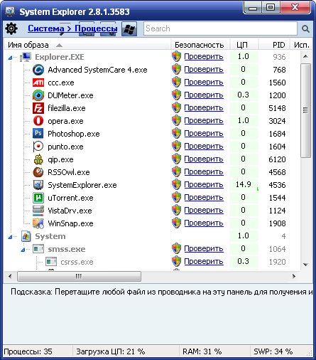 Не пропустит System Explorer и процессы, использующие сеть. Из раздела "система" можно деинсталлировать переставшую быть нужной программу, изменить параметры автозапуска ОС, просмотреть драйвера устройств. В общем, если вас не устраивает стандартный диспетчер задач, попробуйте System Explorer.