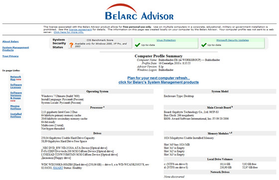 Belarc Advisor - программа, проверяющая уровень безопасности компьютера при подключении к Сети. Belarc Advisor собирает и выводит в браузере детальную информацию об установленном программном и аппаратном обеспечении, обновлениях безопасности Windows, статусе антивируса и Центре Интернет Безопасности (так называемый CIS-контроль). Данные CIS-контроля отображаются в баллах по десятибалльной шкале. Такое предоставление информации дает ясно понять, на сколько хорошо защищен компьютер во время его работы в Интернете. Получить детальную информацию об установленных и неустановленных обновлениях операционной системы можно на сайте программы. Кроме того, средствами Belarc Advisor можно узнать серийные номера установленных программ. Разработчики этого программного комплекса заявляют, что вся собранная информация сохраняется на компьютере и не отправляется ни на какой веб-сервер.