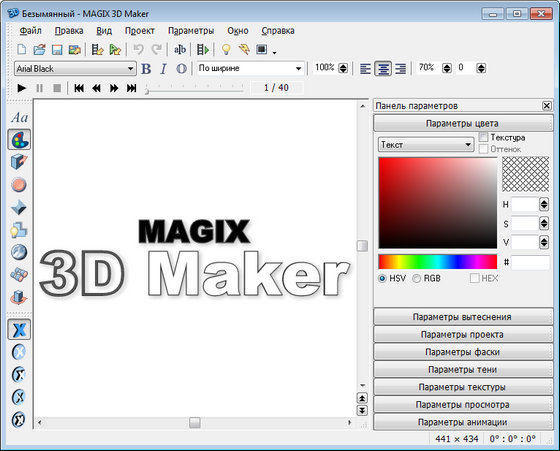 MAGIX 3D Maker - простая программа для создания 3D анимации. Содержит свыше 1000 объектов, поверхностных текстур и шрифтов, плюс около сотни анимированных шаблонов и стилей. Вы можете использовать MAGIX 3D Maker для превращения простого текста и графических шаблонов в профессиональные логотипы, заголовки и кнопки, с помощью которых можно украсить ваши веб-сайты, электронные письма и презентации! Кроме этого, в программе имеется возможность сохранять анимацию в AVI файл, что очень удобно для создания трёхмерных текстов в видео.