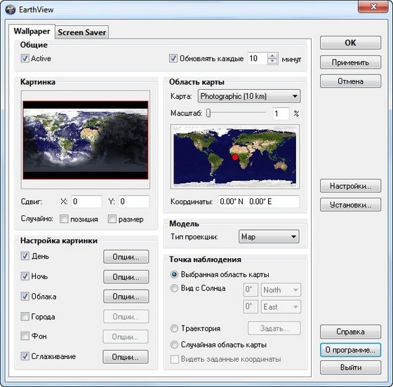 EarthView - это динамические обои и скринсейвер в виде карты нашей планеты или глобуса вращающегося синхронно с оборотом земли (поддерживает смену дня/ночи, облака, огни городов). EarthView может работать как скринсейвер, который создает высокодетализированные красивые виды земли (глобус или карта). Программу выделяют очень высокое качество изображения и насыщенные цвета. Все параметры генерации изображения гибко настраиваются, что позволяет подстроить качество изображения под производительность конкретного компьютера. С сайта разработчика можно скачать дополнительные (фотореалистичные) карты земной поверхности.