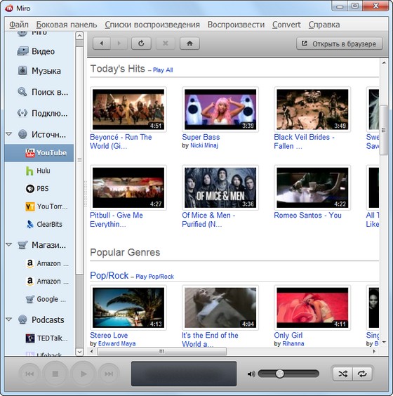 Miro - медиаплеер, основное предназначение которого - облегчение просмотра видео в Интернете. Плеер позволяет подключаться к видео-каналам, загружать видео-файлы на компьютер, просматривать ролики в полноэкранном режиме и т.д. Miro прост в работе и абсолютно бесплатен. Смотрите практически любое видео - Quicktime, WMV, MPEG, AVI, XVID и другие форматы. Просматривайте свою коллекцию, делайте плейлисты, сохраняйте порядок. Подписывайтесь на любые потоки RSS, содержащие видео, подкасты или видеоблоги. Исследуйте сотни свободных каналов при помощи встроенной программы передач.