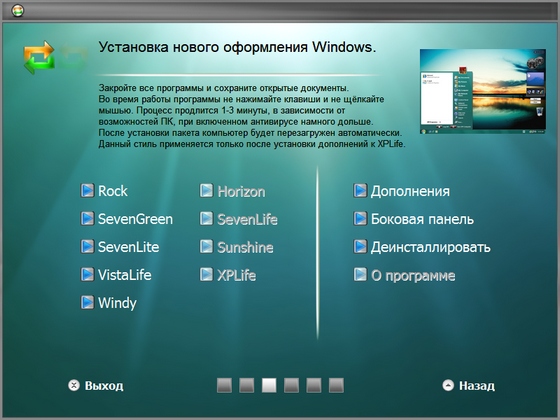 XPLife очень проста и интуитивно понятна, не добавляет новых тяжёлых визуальных элементов, заменяются только стандартные, благодаря чему не влияет на скорость работы системы. Всего один клик и Windows преображается до неузнаваемости. В меню программы есть комментарии, которые помогут всё сделать правильно.