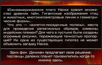 Эрих фон Дэникен пытается разгадать тайну плато Наска и приходит к выводу, что она связана с инопланетянами, не раз бывавшими на Земле и оставившими свидетельства своего присутствия по всему миру. Автор исследует гравированные камни, глиняные фигурки южноамериканских индейцев и загадочные изображения на плато, анализирует, сопоставляет и делает ошеломляющие выводы.