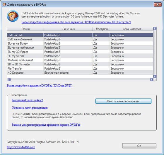 DVDFab – мощный, многофункциональный программный продукт для копирования DVD дисков с возможностями гибкой обработки видеопотока. Программа является одной из лучших на сегодняшний день, из инструментов для копирования, разбиения, пережатия и конвертирования DVD дисков с фильмами. Снимает все защиты и ограничения с диска и при желании пережмет диск большой емкости и вместит его в обыкновенную пустую DVD болванку с минимальными потерями качества (DVD9->DVD5) или разобьет фильм на два диска с полным переносом его меню, удалит всю рекламу, запишет только фильм и многое другое. Программа имеет интуитивно понятный, мультиязычный интерфейс включая русский.