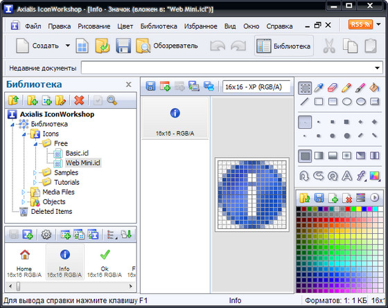 Axialis IconWorkshop - мощная программа для создания высококачественных профессиональных иконок, а также для их редактирования. Основана на многооконном интерфейсе, что даёт возможность одновременно редактировать сразу несколько иконок. Среди нестандартных инструментов редактора, нужно отметить градиентные заливки и 3D эффекты. При редактировании иконки можно пользоваться многоуровневой отменой действий. Программа умеет создавать иконки (ICO), а также ICL и DLL файлы с иконками. Может модифицировать иконку прямо в приложении или библиотеке. Импортирует JPEG и BMP файлы.