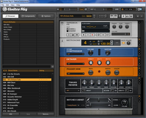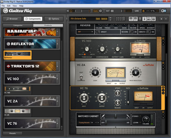 Guitar Rig Pro — профессиональное решение для записи электро- или бас-гитары на вашем компьютере. В состав этого мощного и логичного программного обеспечения входит множество точных копий аппаратных усилителей, кабинетов, микрофонов и эффектов. В четвертой версии программы представлено 2 новых усилителя, 4 новых невероятно гибких эффекта, а также новая революционная аппаратная комната для придания звучанию студийного качества. Перед музыкантами открываются возможности использования в своем творчестве 15 потрясающих гитарных и басгитарных усилителей, предельно точно воссозданных в программе благодаря технологии эмуляции лампового звучания Dynamic Tube Response. Сохранив в себе оригинальные схемы многоканальной обработки и все специфические характеристики, эти усилители способны не только передавать звучание их прототипов, но и обеспечить пользователя огромным арсеналом настроек звучания для любого жанра музыки.
