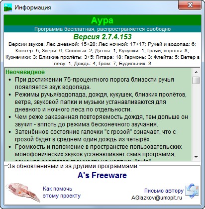 "Аура" — это программа, которая создает на вашем компьютере звуковую атмосферу дневного и ночного леса. Достаточно одного щелчка по значку, чтобы выключить или включить воспроизведение. Пульт управления, вызываемый правым кликом по значку, позволяет настроить активность птиц, цикад, ручья, водопада, дождя, грома, костра, зверей, флейты, гитары, скрипки, виолончели, назначить автоматическую смену аур (с заданной периодичностью или в соответствии с временем суток), задать автоматический старт программы при включении ПК, выбрать автоматическое выключение компьютера в заданное время (для любителей засыпать под умиротворяющие звуки леса).