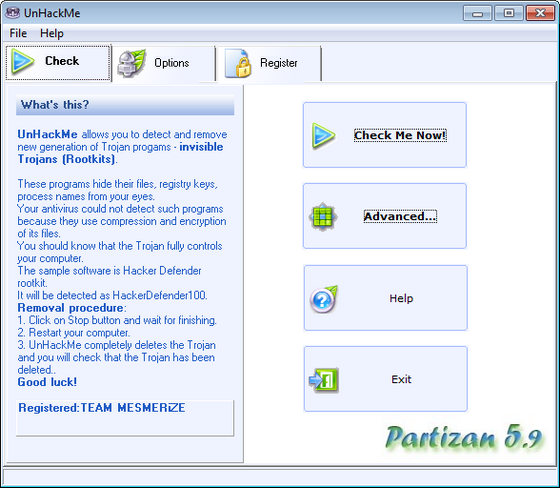 UnHackMe позволяет вам обнаруживать и удалять новое поколение троянских программ - скрытые Трояны. Их называют "rootkits". Rootkit - набор программ, которые хакер использует, чтобы замаскировать вторжение и получить доступ с привилегиями администратора к компьютеру или компьютерной сети.
