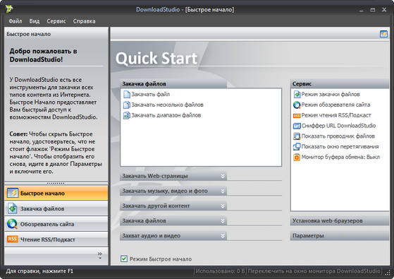 DownloadStudio - это универсальный комбайн для скачивания файлов и сайтов из Интернета. С ее помощью вы можете скачивать файлы в многопотоковом режиме, закачивать отдельные страницы или целые сайты для просмотра их в offline-режиме, а также осуществлять захват видеоизображения с экрана компьютера. Использование данной программы позволит вам отказаться от установки на компьютер программ, выполняющих все вышеперечисленные функции раздельно.