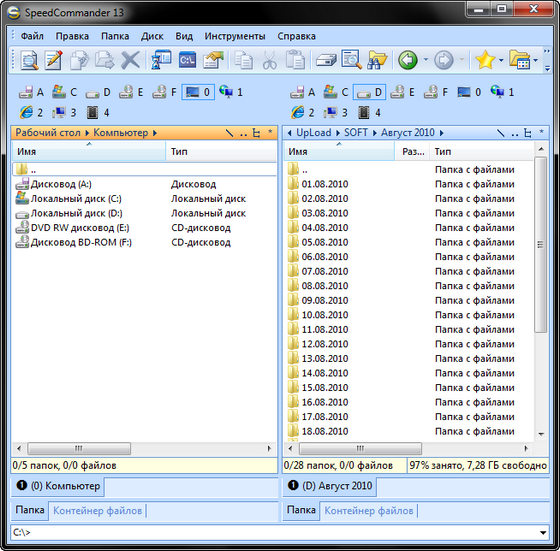 SpeedCommander - файловый менеджер с многочисленными, в том числе и уникальными, возможностями по работе с файлами. Из не совсем обычных функций имеет смысл обратить внимание на мощную систему шифрования файлов (файлы сжимаются - внутренняя поддержка ARJ, ZIP, LHA, RAR, CAB, ACE, GZIP, TAR и UUE, затем шифруются по стойкому алгоритму DES, а потом ещё и их названия можно защитить паролем). Кроме этой довольно редко встречаемой опции, в SpeedCommander имеется встроенная поддержка просмотра около восьми десятков графических и текстовых форматов; есть полнофункциональный текстовый редактор с подсветкой синтаксиса и не менее полнофункциональный FTP-клиент.