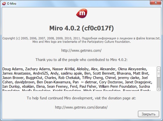 Miro - медиаплеер, основное предназначение которого - облегчение просмотра видео в Интернете. Плеер позволяет подключаться к видео-каналам, загружать видео-файлы на компьютер, просматривать ролики в полноэкранном режиме и т.д. Miro прост в работе и абсолютно бесплатен. Смотрите практически любое видео - Quicktime, WMV, MPEG, AVI, XVID и другие форматы. Просматривайте свою коллекцию, делайте плейлисты, сохраняйте порядок. Подписывайтесь на любые потоки RSS, содержащие видео, подкасты или видеоблоги. Исследуйте сотни свободных каналов при помощи встроенной программы передач.