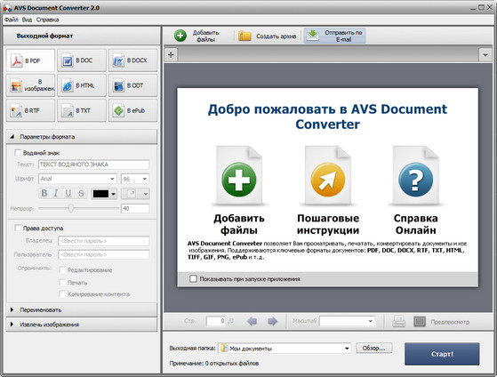 AVS Document Converter - предназначена для просмотра и конвертации разных типов документов. Она читает текстовые и графические файлы и конвертирует их в PDF, DOC, DOCX, RTF, TXT, ODT, HTML, JPEG, TIFF, EPUB и другие форматы.