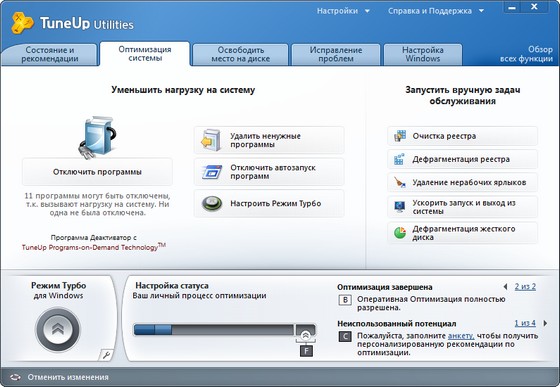 TuneUp Utilities предлагают Вам два новых метода оптимизации, которые гарантируют оптимальную работоспособность даже при высокой загруженности компьютера. В случае необходимости, быстродействие будет увеличено или ускорится процесс запуска программы.