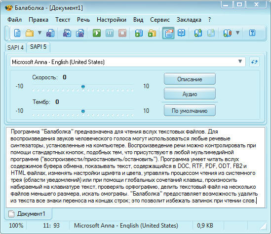 Текст может быть сохранен в вида аудиофайла (поддерживаются форматы WAV, MP3, OGG и WMA). Программа умеет работать с различными версиями пакета речевых функций Microsoft Speech API (SAPI). Он позволяет изменять скорость и тембр речи.