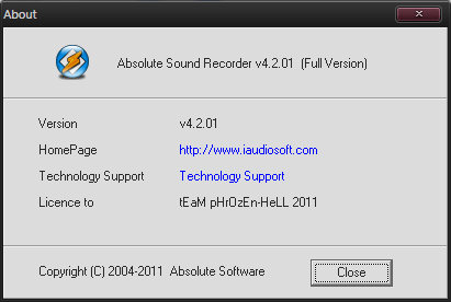 Absolute Sound Recorder - позволяет записать звук с любого источника: микрофон, линейный вход, аудио сигналы из Интернет, аудио/видео проигрывателя, игрушек и любой другой звуковой сигнал который поступает на звуковую карту. Записанный звук Absolute Sound Recorder может сохранить в большинстве распространенных аудио форматах, среди которых WAV, MP3, WMA и т.д.