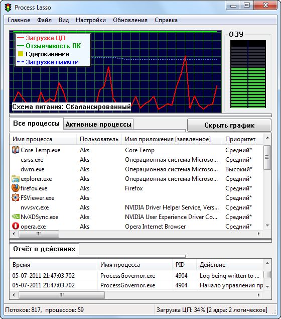 Windows, по умолчанию, позволяет программам полностью загружать центральный процессор, что ведет к зависанию системы и, соответственно, к неудобству работы. Технология ProBalance (Process Balance) программы Process Lasso аккуратно перераспределяет приоритеты запущенных программ, так что процессы, которые ранее загружали весь центральный процессор, больше не будут влиять на отклик системы.