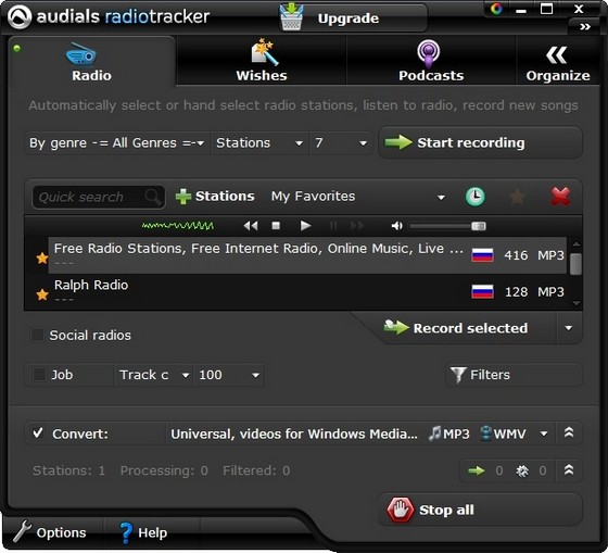 Новейшая технология, автоматически скачивает любую песню менее, чем за минуту. Это самый популярный, самый надежный и самый продвинутый инструмент для Интернет радио. Не нужно подписок, никаких отчислений, просто музыка в идеальном качестве. А благодаря тому, что музыка бесплатна и была записана легально в реальном времени с Интернет радиостанций, она не защищена от записи и копирования.