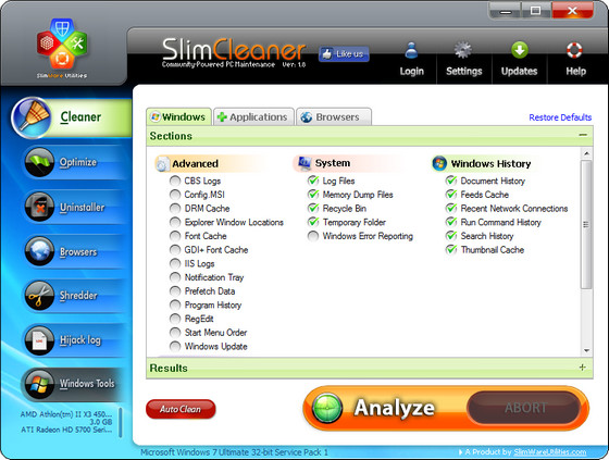 В комплект SlimCleaner входят утилита для деинсталляции приложений и «шредер» для безопасного уничтожения файлов, папок и т.д. Есть возможность анализировать содержимое меню автозагрузки и взаимодействовать с активными службами, а также генерировать журнал Hijack Log, подробного списка всех инструментальных панелей, браузерных «помощников», плагинов ActiveX и других объектов второстепенной важности, установленных в системе. С помощью предлагаемых инструментов пользователи смогут добиться максимально производительной работы системы.